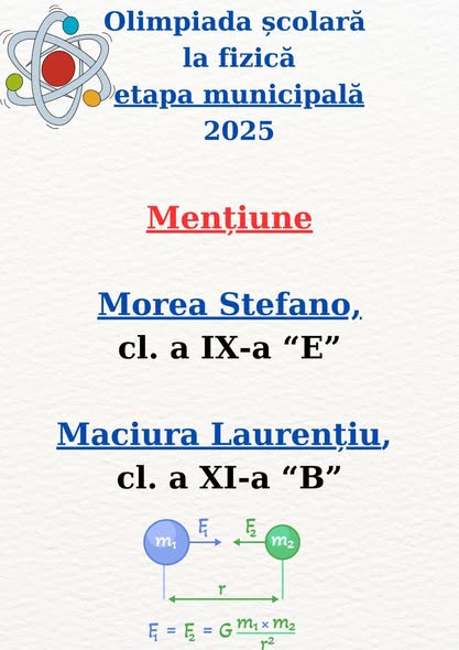 Mențiune – Morea Stefano, clasa a IX-a “E”, profesoară Dna Vovcenco Ecaterina;
