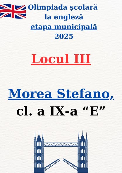 Locul III – Morea Stefano, clasa a IX-a “E”, profesoară Dna Bogaci Tatiana